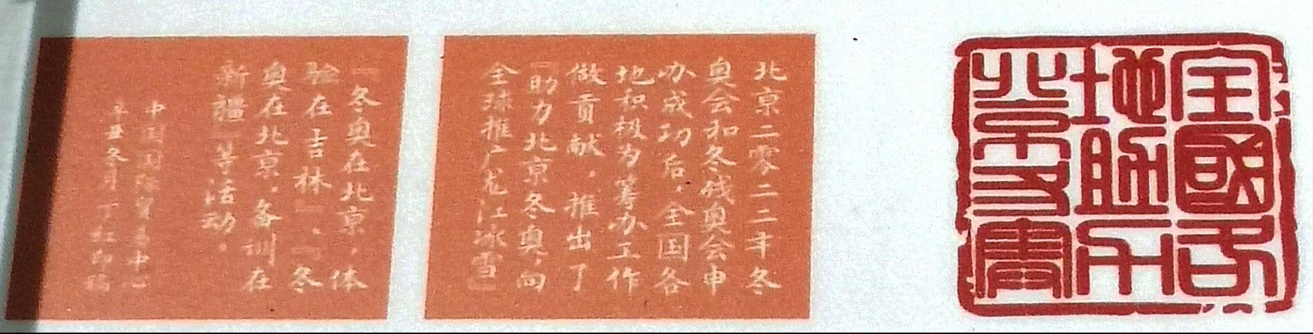 作品邊款:北京2022年冬奧會和冬殘奧會申辦成功后,全國各地積極為籌辦工作做貢獻,推出了“助力北京冬奧,向全球推廣龍江冰雪”、“冬奧在北京,體驗在吉林”、“冬奧在北京,備訓在新疆”等活動。