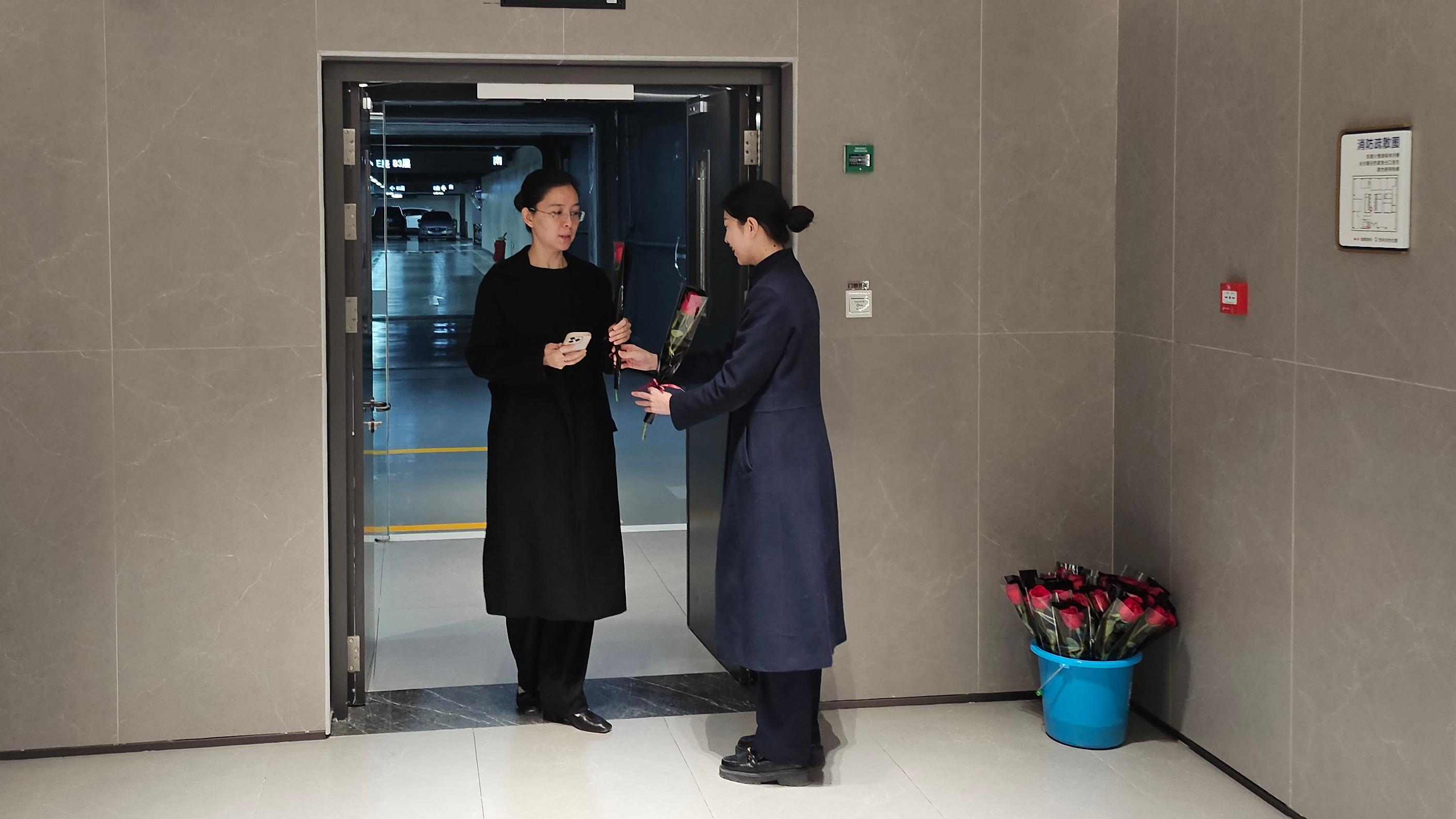 3月8日當天,提前準備好的物業(yè)工作人員早早地站在大廈入口處,手捧鮮花,笑容滿面地等待著每一位女性業(yè)主的到來。當業(yè)主們踏入大廈時,工作人員便熱情地將花束遞到她們手中,并送上一句真摯的“婦女節(jié)快樂”。接過鮮花的業(yè)主們驚喜不已,臉上洋溢著燦爛的笑容,不少人當場與物業(yè)工作人員合影留念,記錄下這一溫馨時刻。