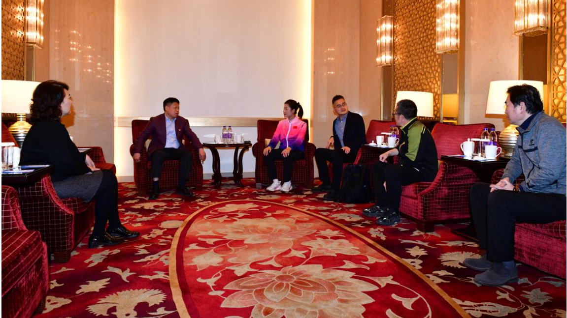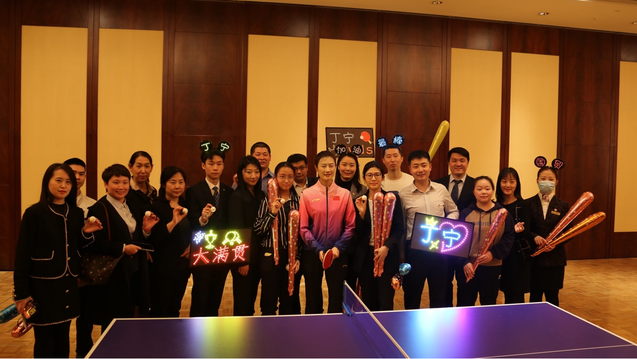 3月7日,乒乓球奧運(yùn)冠軍丁寧來到中國國際貿(mào)易中心(以下簡稱國貿(mào)中心),在國貿(mào)中心學(xué)習(xí)貫徹黨的二十大精神報(bào)告會(huì)上與國貿(mào)中心員工進(jìn)行了交流分享,并與這里的乒乓球球友切磋球技。