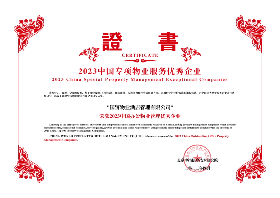 在此次活動(dòng)中,國貿(mào)物業(yè)酒店管理有限公司憑借在高端物業(yè)服務(wù)的實(shí)踐經(jīng)驗(yàn)和核心競爭優(yōu)勢,榮獲“2023中國高端物業(yè)服務(wù)領(lǐng)先企業(yè)、2023中國專項(xiàng)物業(yè)服務(wù)優(yōu)秀企業(yè)-辦公物業(yè)管理、2023中國專項(xiàng)物業(yè)服務(wù)優(yōu)秀企業(yè)-商業(yè)物業(yè)管理”等多項(xiàng)榮譽(yù)。