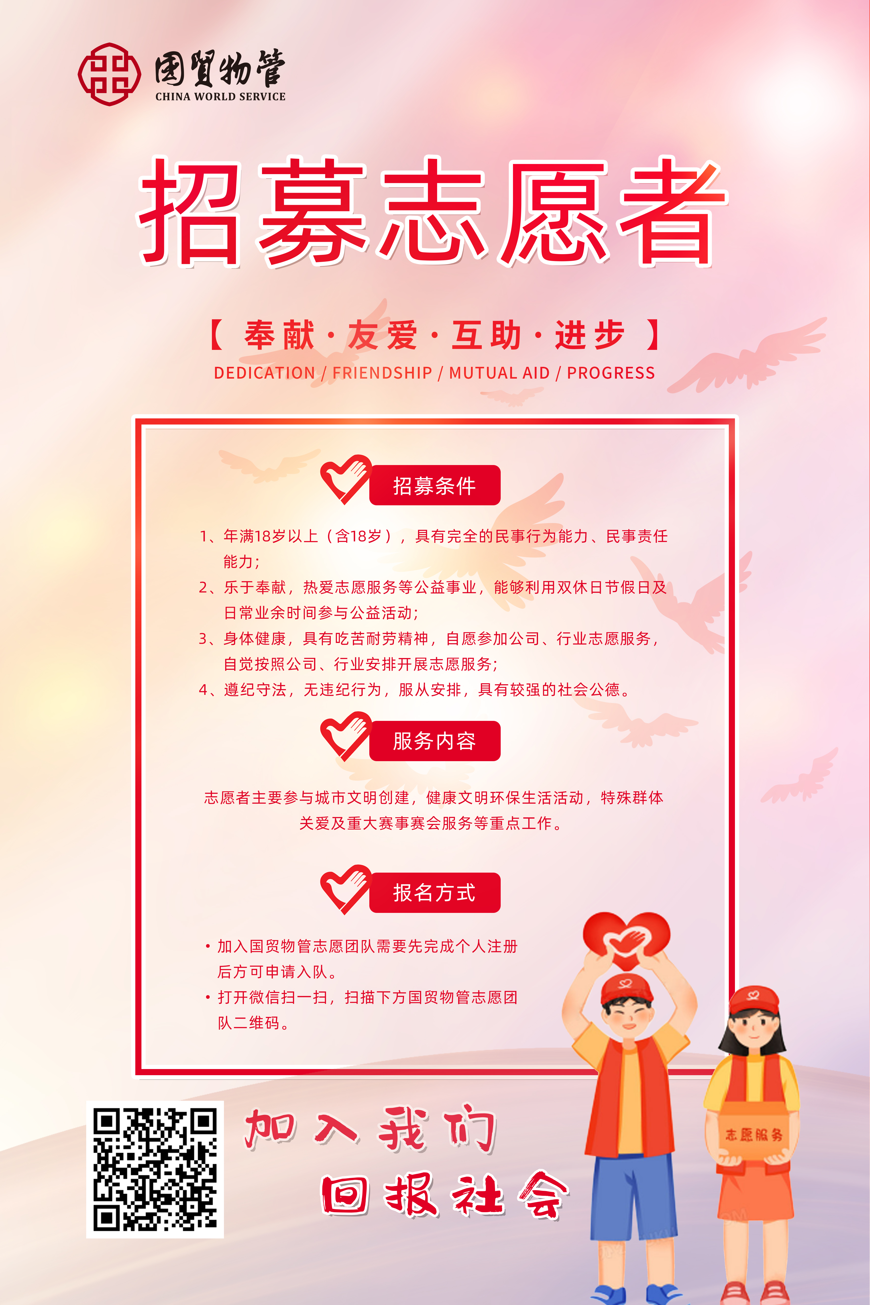 3月5日是“學(xué)雷鋒活動(dòng)日”也是“中國青年志愿者服務(wù)日”,為了讓學(xué)雷鋒志愿服務(wù)活動(dòng)融入日常、化作經(jīng)常,公司在大力弘揚(yáng)“奉獻(xiàn)、友愛、互助、進(jìn)步”志愿精神的同時(shí),持續(xù)提升員工的個(gè)人價(jià)值和公司的企業(yè)責(zé)任,今天,公司正式啟動(dòng)了國貿(mào)物管志愿服務(wù)團(tuán)隊(duì)征集活動(dòng)。